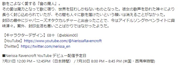 そして、「Nerissa Ravencroft」さんは2023年7月30日に『ホロライブEN』からデビューし、7月31日に初配信をしました。